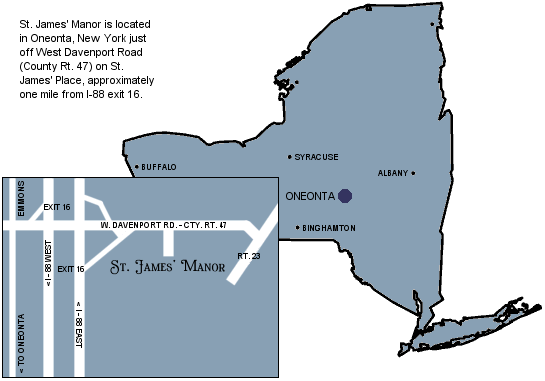 | St. James' Manor Congregate Apartments and Duplex Houses are conveniently located in a beautiful wooded setting on West Davenport Road (County Rt. 47) just minutes from downtown Oneonta's shopping, restaurants, medical clinics and A.O. Fox Hospital. Our area map below will show you where we are located in correspondence to most major cities in Upstate New York, including a close up view of our location within Oneonta. |